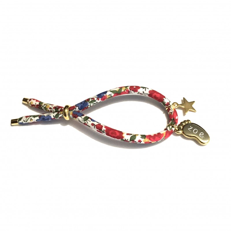 Pulsera cordón de estampado de flores Liberty London personalizada, con pie mini de zamak dorado con estrella, a elegir entre varios estampados.